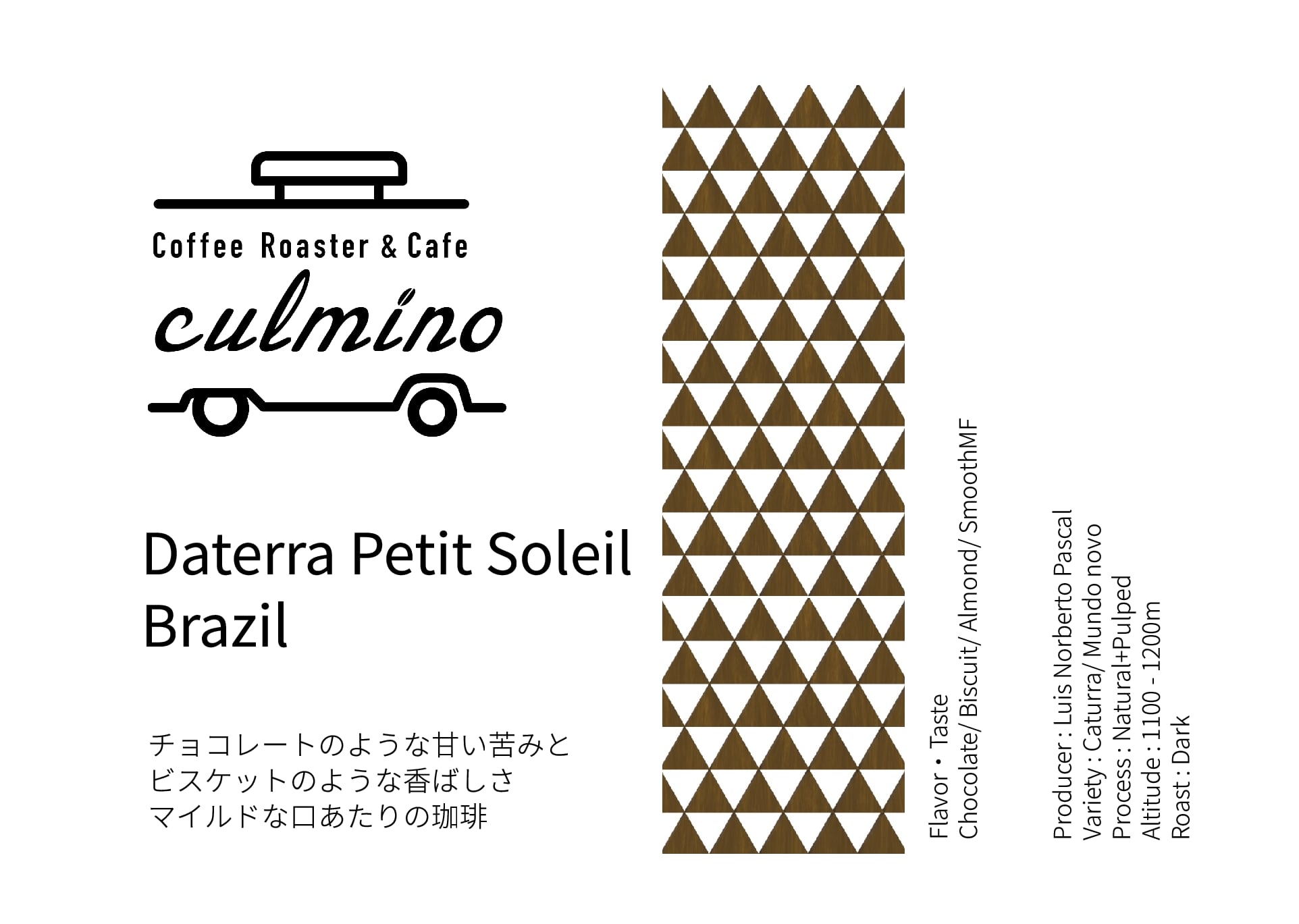 「プチソレイユ」は、非常にバランスのとれたプロファイルを持つ小粒の豆のみのセレクションです。ブラジルらしいチョコやナッツのような甘さや香ばしさ、柔らかいクエン酸系の酸味も感じられます。